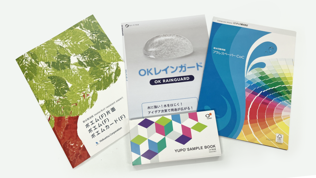 今回は、 ポエムカード(F)/OKレインガード/プラレスペーパーCoC/YUPO®/という4種類の耐水性を持った素材を比較します それぞれの特徴と得意な使いどころから、用途別の“最適な紙選び” をご提案します。