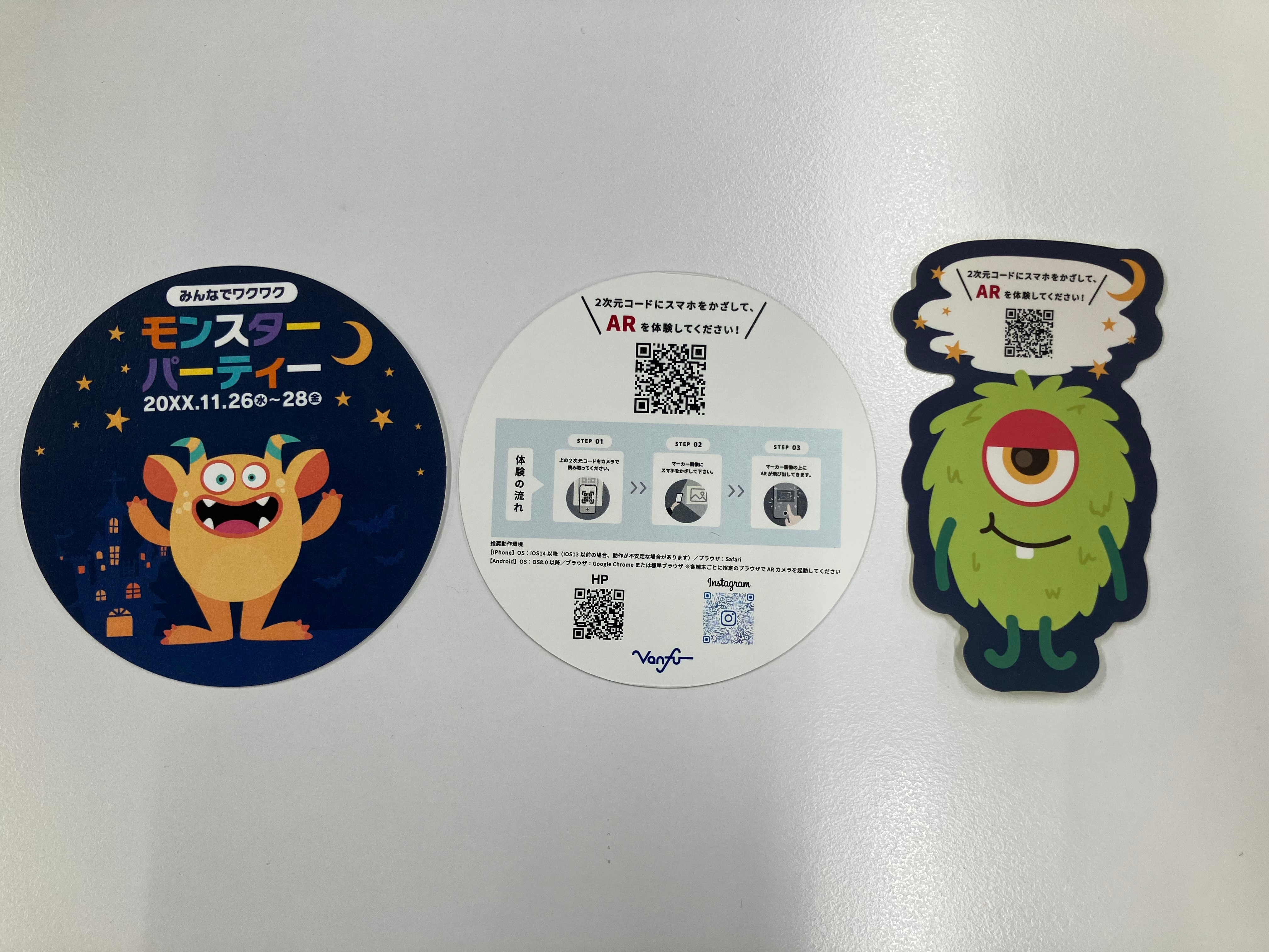 AR体験用ノベルティとして、コースターとステッカーを作成しました。