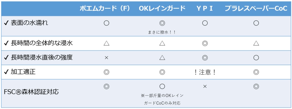実験結果を踏まえて、基準を考えてみました。“耐水”だけの面で考えるとYPI一択のように思われますが、印刷や加工のしやすさ、FSC®森林認証対応なども踏まえて、下記のように考えました!