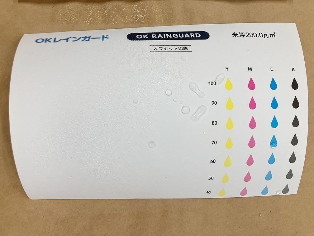 OKレインガードは、撥水性を高めた耐水紙です。湿気や水滴に強く、雨に濡れる可能性があるシーンでも安心です。印刷適性が高く、オフセット印刷・レーザープリンター印刷にも対応しています。雨や湿気に強く、撥水性、耐水性に優れているので、野外で使用するレジャー用品や建築現場、結露のしやすい冷凍冷蔵食品の包装紙など、さまざまな分野で活躍しています。