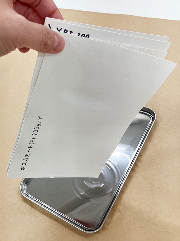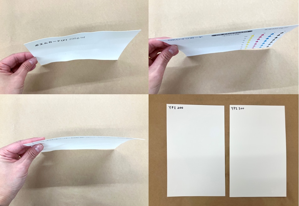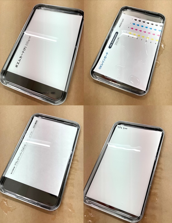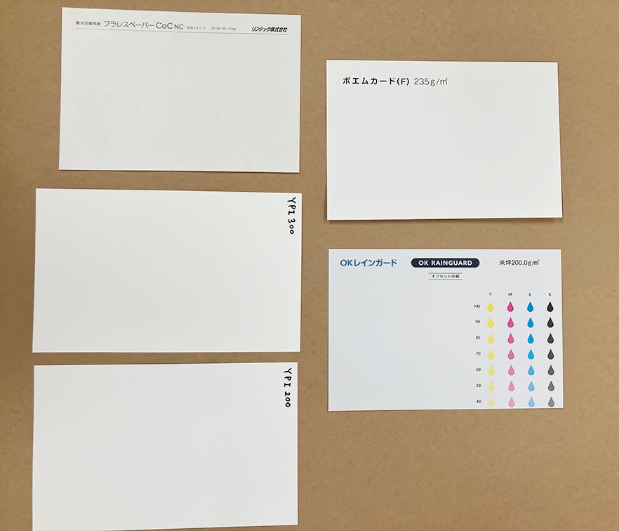 予定していた3種に加えて、前回ご協力いただいた用紙卸のパートナーさんからおすすめされた、プラレスペーパーCoCも追加して比較してみます。