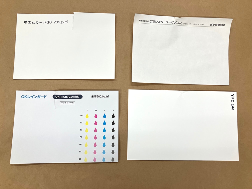 今回は、 ポエムカード(F)/OKレインガード/プラレスペーパーCoC/YUPO® という4種類の耐水性を持った素材を比較します。それぞれの特徴と得意な使いどころから、用途別の“最適な紙選び” をご提案します。