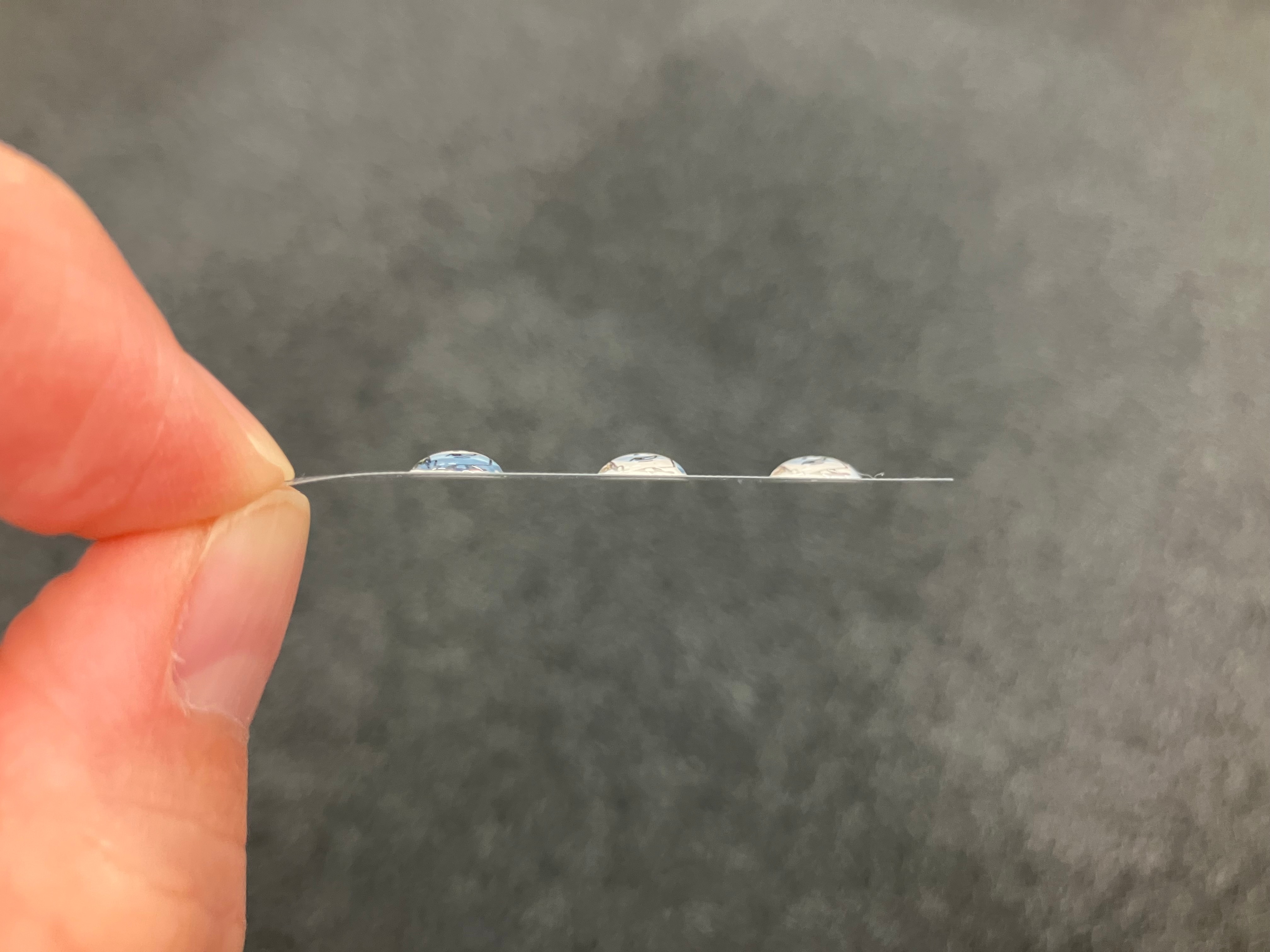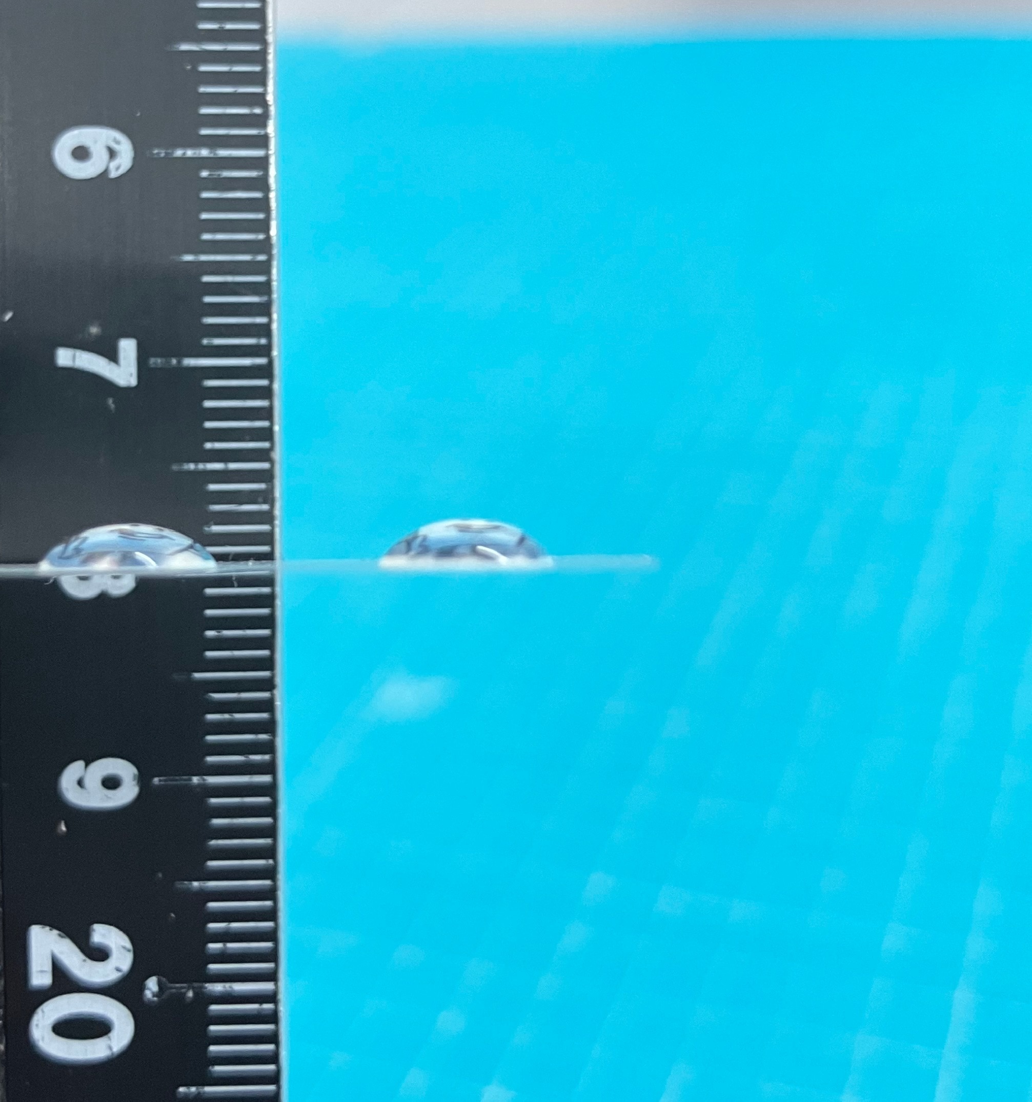これは50×50mmを横からみた写真です。表面張力はたらいてますね!もっともっと端の方はなだらかになっているかと想像していましたが、私の想像よりはもりっとしていました。