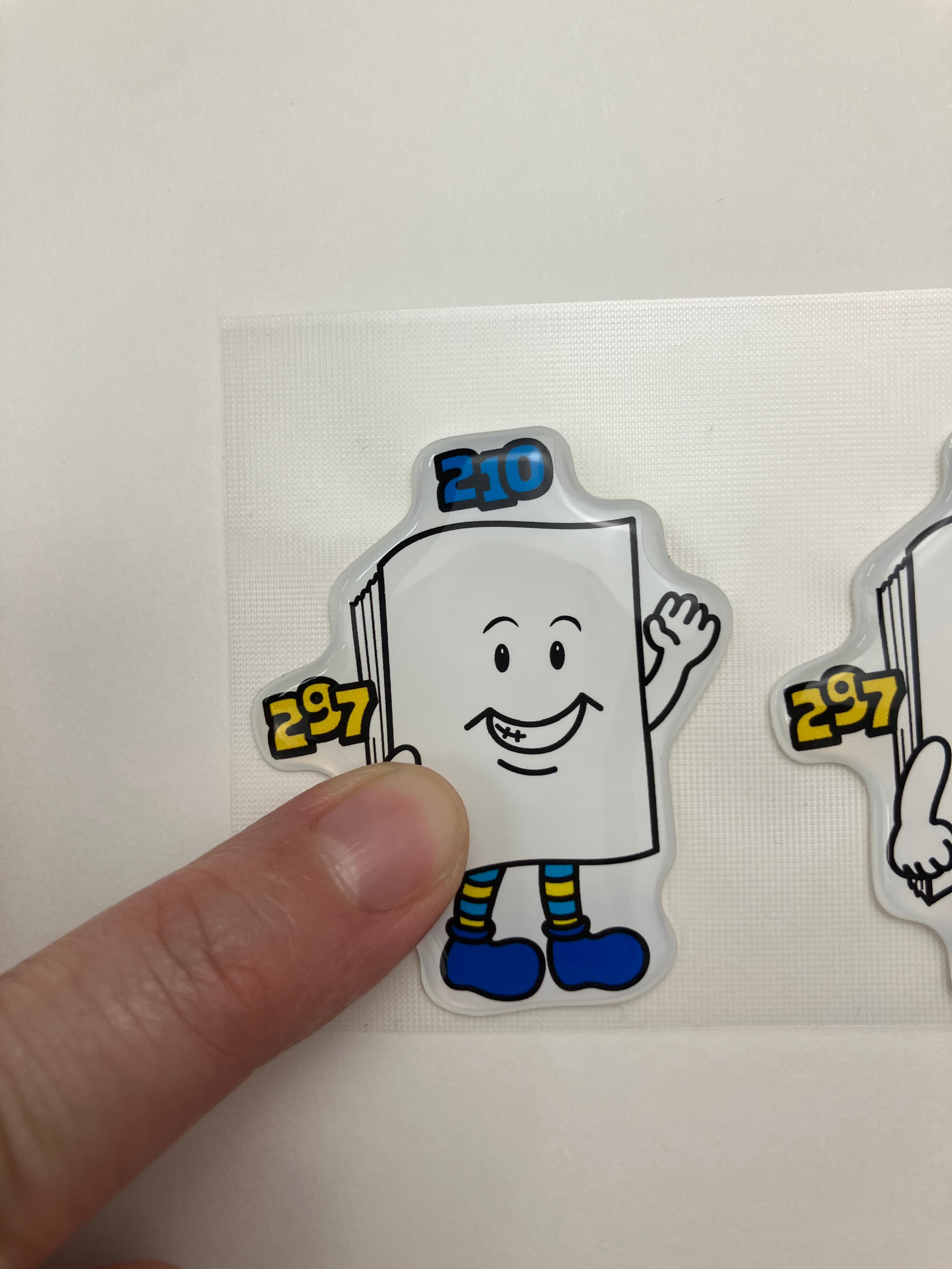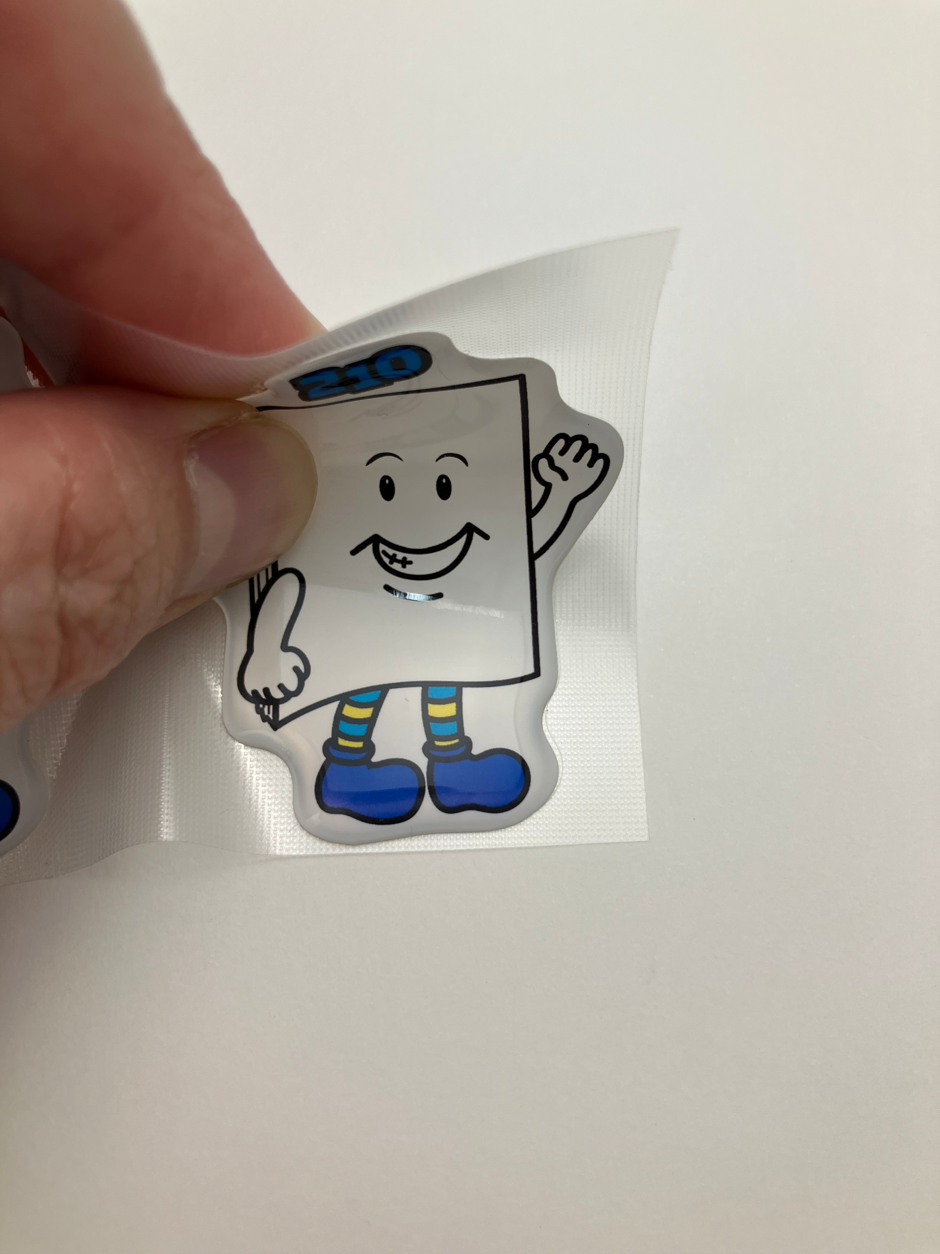 印刷したシールの表面に透明な樹脂(エポキシ樹脂やポリウレタン樹脂)を垂らし、自然な表面張力でドーム状にぷっくりと盛り上げて硬化させる加工方法です。