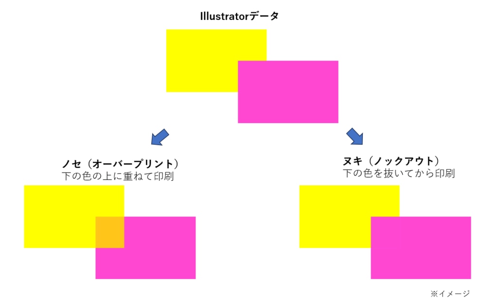 印刷では、色が重なる部分を、「ノセ」か「ヌキ」のどちらかで表現します。