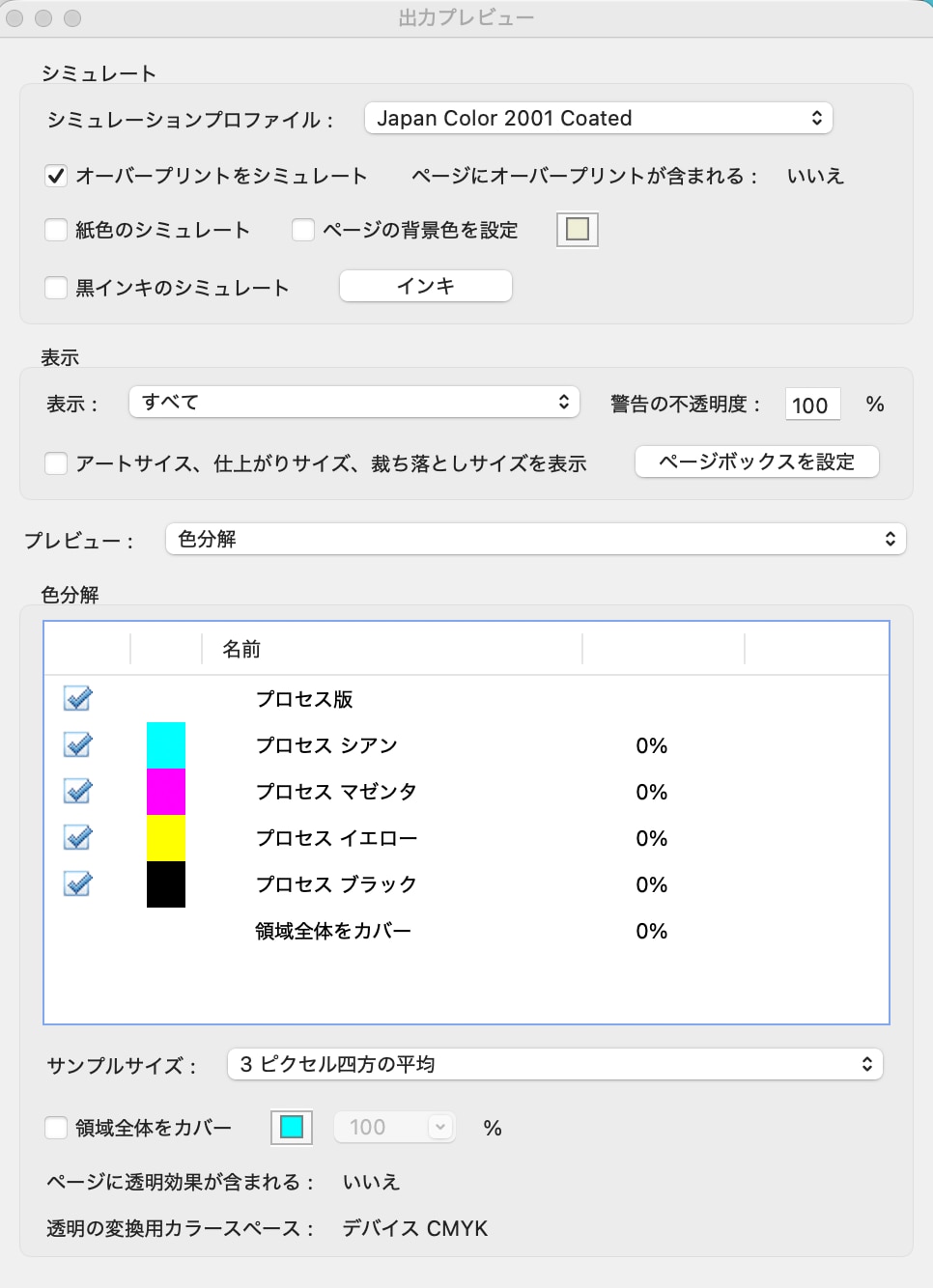 または、出力プレビューのシミュレートでも、「オーバープリントをシミュレート」で確認できます。