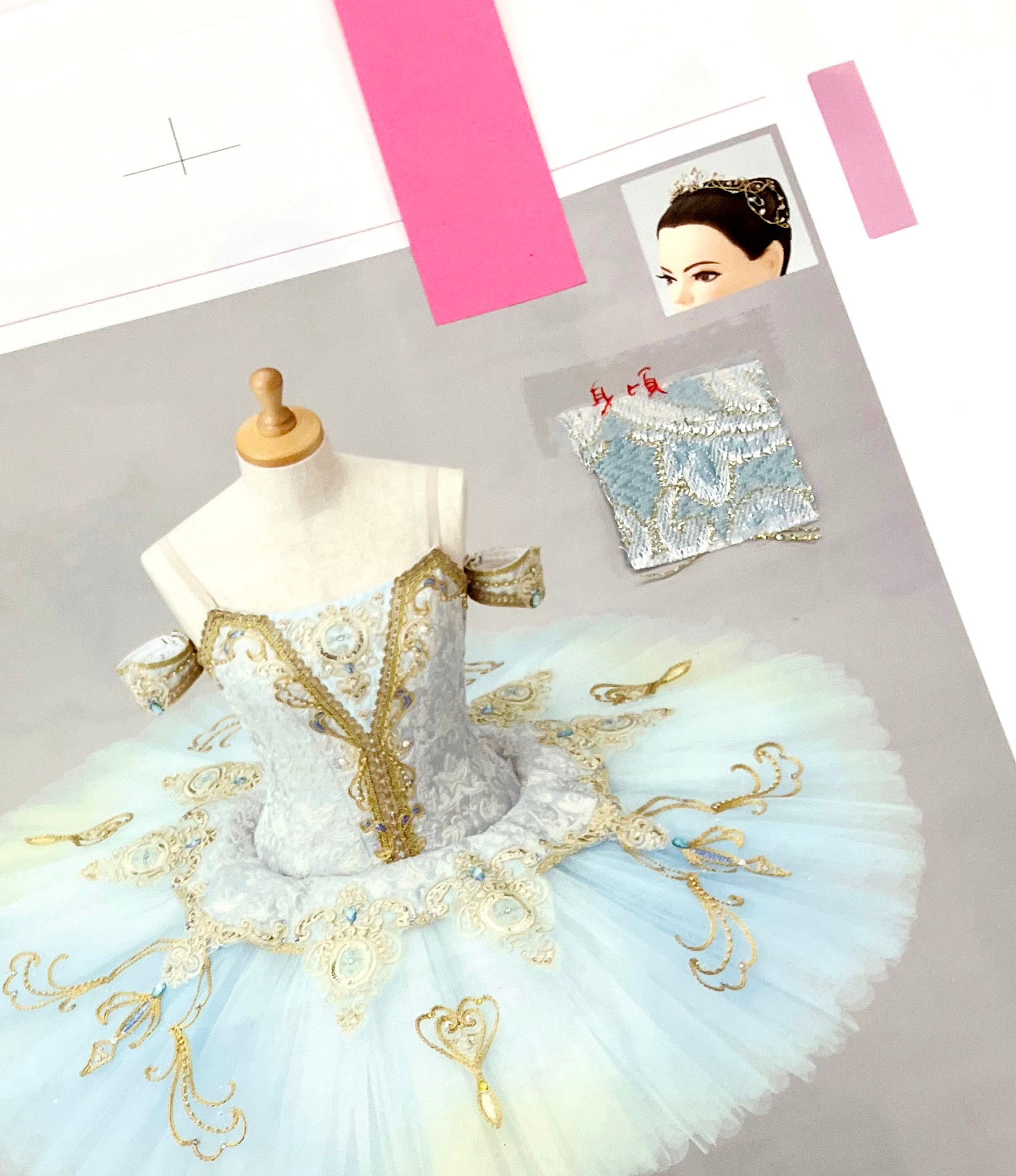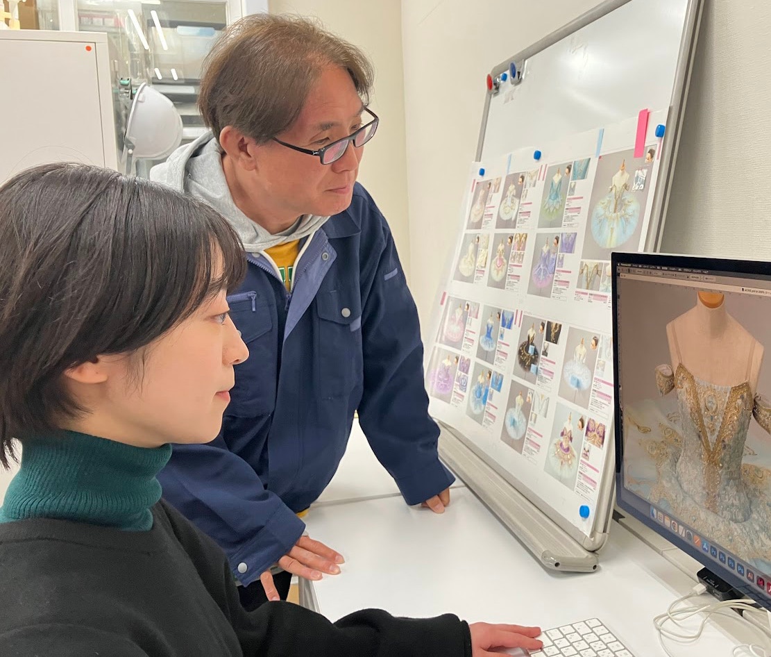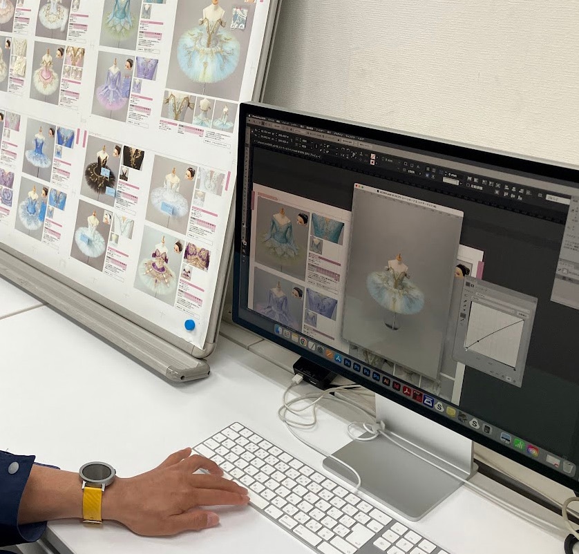 制作工程では、DDCP校正を2度実施。お客様との丁寧なやり取りを重ねながら、写真上の表現と実物衣装のイメージとの差を一つひとつ埋めていきます。特にバレエ衣装は、
