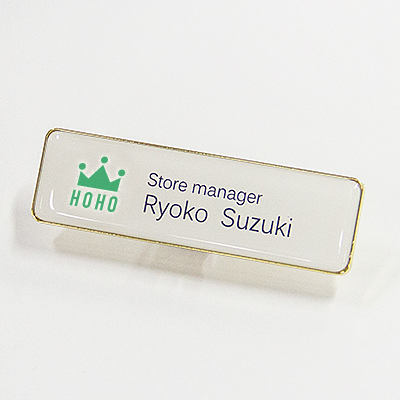ロゴや写真が入れられるフルカラータイプ。表面は樹脂シールコーティング仕上げ、フレームはゴールド・シルバー・ホワイトの3色にカスタマイズできます。