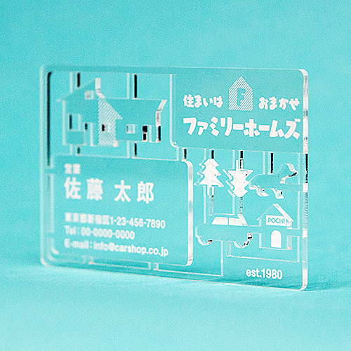 透明アクリル製のプラモデルをイメージした名刺です。アクリルを精細にカットしたフォルムは、男心をくすぐります。モチーフは3タイプ。納車などの記念としてもオススメ。社名やお名前をお入れして1枚からご注文いただけます。