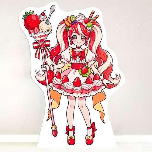 一般的なパネル印刷にある「白いフチ(余白)」を完全になくした、プロ仕様の等身大パネル作成サービスです。「フチなしフラスタ」や「イベント展示」において、キャラクターや人物がそこにいるような圧倒的なクオリティを実現します。
