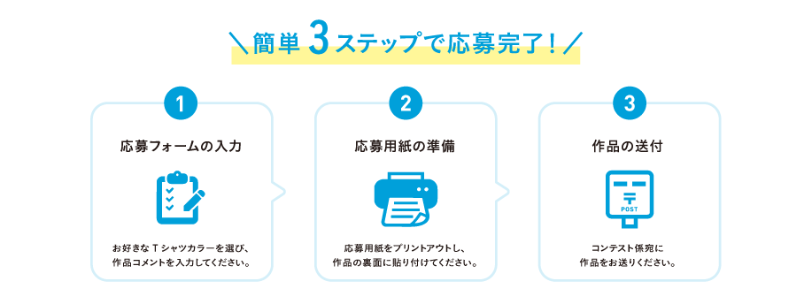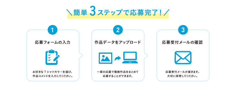応募フォームにて、応募者情報をご入力ください。その後、Tシャツカラーを選択し、作品に対するコメントをご入力ください。