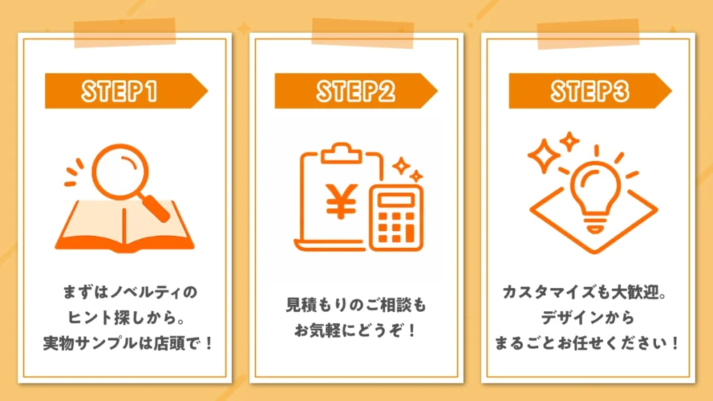 ノベレピのアイテムは、ポストカードやステッカーだけでは出せない、特別感・驚き・コレクション性が魅力。手に取った瞬間、SNSに載せたくなる設計です。工夫次第で、追加購入や来場動機にもつながります。