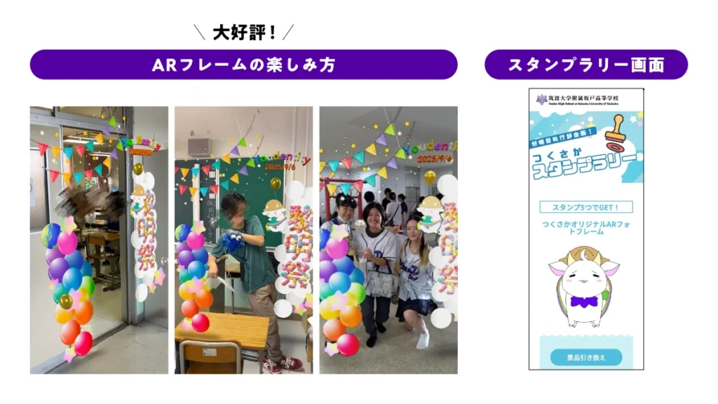 特に反響があったのが卒業生でした。生徒会オリジナルキャラクター「つく丸」を使ったデジタルスタンプラリーは、家族連れの方にも楽しんでいただけました。
