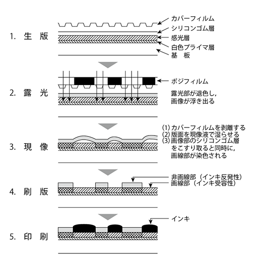 ネガタイプの場合、刷版上にシリコン層を作り、その下層に画線部となる感光性樹脂層をおき、フィルムを焼き付けて感光した部分の上にあるシリコン層だけが現像処理で剥離し親油性の樹脂層が露出することで画線部を形成する仕組みである。現在、CTP版はネガタイプのみである。